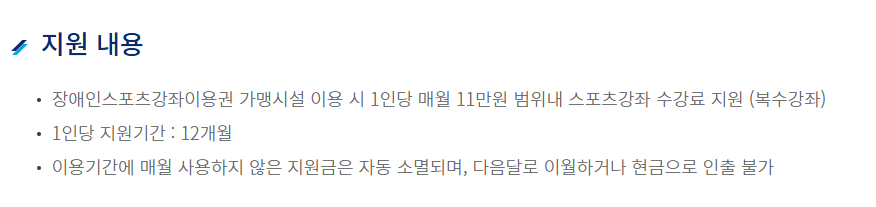 이 지원금은 장애인들이 유료 스포츠 강좌에 참여할 수 있는 기반을 마련해주며, 장애인들의 신체 건강 증진뿐만 아니라 사회적 상호작용을 촉진시키는 데 큰 기여를 합니다.